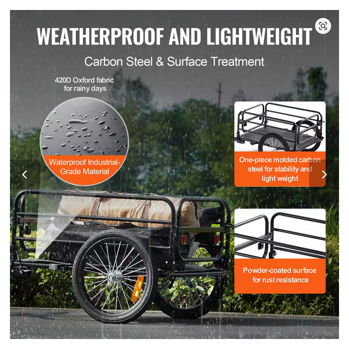 Materijal industrijskog kvaliteta: Izrađena od materijala industrijskog kvaliteta, prikolica za bicikl ima robustan čelični okvir sa površinom obloženom prahom za otpornost na hrđu. Ova konstrukcija osigurava dugotrajnu čistoću i elegantan izgled, a istovremeno obećava strukturnu stabilnost i izdržljivost.