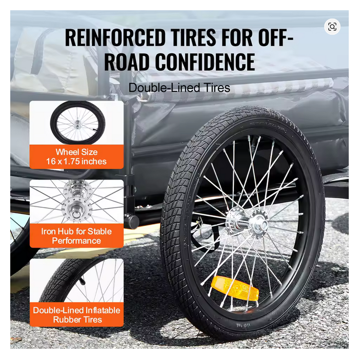Professionelles Reifendesign: Leichtgängig auf jedem Untergrund! Unser Fahrradanhänger ist mit sportlichen 16" x 1,75"-Reifen und stabilen Naben ausgestattet und bietet hervorragende Fahreigenschaften. Stabilität und Traktion auf verschiedenen Untergründen, egal ob auf Beton, Schotterwegen oder Sandpisten.