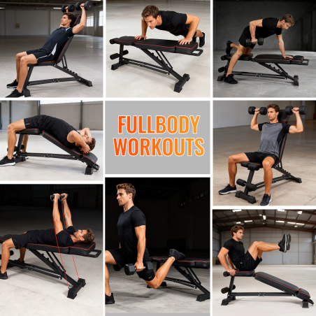 Entdecken Sie die Möglichkeiten des Ganzkörpertrainings: Rückenlehne, Sitzkissen und Beinstütze lassen sich unabhängig voneinander verstellen und ermöglichen vielfältige Winkelkombinationen – von der Liegeposition über schräges Drücken bis hin zur aufrechten Position. So sind Sie bestens für Bankdrücken, Kurzhantel-Schulterdrücken, Bauchrollen mit Gewichten, Reverse Bird und viele weitere Übungen gerüstet und können Ihre gesamte Muskelgruppe effizient trainieren.